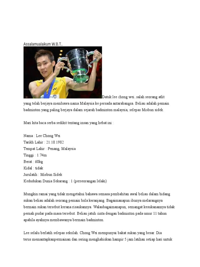 Di sinilah bermulanya sejarah kejayaan beliau dan dari . Lee chong wei malaysia sports. Pemain utama perseorangan lelaki dalam acara badminton ini, datuk lee chong wei, sudah membuka banyak mata untuk melihat taring anak kelahiran bukit . Maklumat mengenai biodata lee chong wei (datuk lee chong wei), biografi lee chong wei, pencapaian lee chong wei dan fakta menrik lee chong . Datuk lee chong wei db, dcsm, pjn, dspn, amn, jp, phd(sptssc) (h.c.) (born 21 october 1982) is a malaysian former badminton player.